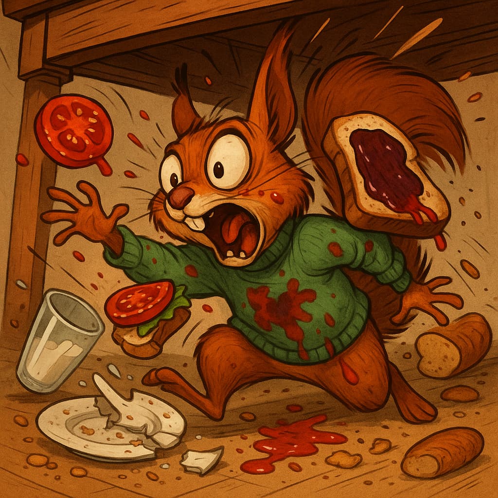 wenn du ein tomatenbrot mit der hand isst, dir ne tomatenscheibe runterfällt und du sie beim essen aufhebst und beim herunterbeugen mit dem ärmel deines pullis die nächste brotscheibe mit pflaumenmus vom teller so herunterwischst, dass sie (natürlich!) mit mus nach unten auf deinem schulterblatt landet, während du unterm tisch gebeugt bist.