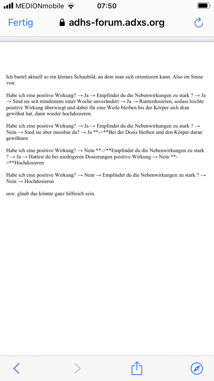 Hey, das was JinRoh geschrieben hat, kann ich bestätigen. Ich habe auch lange mit sehr niedrigen Dosen (15 mg) rumhantiert und hatte ähnlich Nebenwirkungen wie du. Also Artikulationsprobleme, Reizüberflutung, angespannt oder sogar aggressiv sein. Nach meiner Theorie hat es damit zu tun, dass wenn das Medikament zu niedrig dosiert ist, es eher auf das Noradrenalin und weniger auf Dopamin wirkt. Das bedeutet dein Nervensystem ist im Kampf- bzw. Angstmodus. Das führt zu erhöhtem Blutdruck und das wiederrum macht sich in unterschiedlichen Ausprägungen bemerkbar. Wenn das Medikament aufhört zu wirken und du wieder ein normales Maß an Aktivierung hast, fühlt es sich vielleicht besonders angenehm an und es macht den Eindruck als würde das Medikament erst jetzt wirken. Ich selber habe eine kPTBS, was aus meiner Sicht zur Folge hat, dass mein Nervensystem auf diese Disbalance der Hormone so sensibel reagiert und es Zeit braucht um sich daran zu gewöhnen. Meine Apothekerin hat mir gestern auch nochmal gesagt, dass die Medikamente die Disbalance des Gehirnstoffwechsels bei ADHS regulieren und auf ein normales Maß bringen sollen. Das bedeutet also auch, dass wenn das Medikament zu niedrig ist, diese Disbalance noch verstärkt werden kann und man sich schlechter fühlt also ohne Medikamente. Ich habe mich jetzt bei meinem zweiten Versuch fast strikt an die Eindosierungsempfehlung der Hersteller gehalten. Also 1 Woche 30 mg, 5 Tage 40 mg und jetzt 1 Woche 50 mg. Erst bei 50 mg merke ich, was es bedeutet wenn das Medikament wirklich wirkt. Ich nämlich auf einmal reden und dabei denken kann, ohne mich zu verhaspeln. Genauso beim schreiben. Das einzige Problem, was ich habe, ist dass ich zu viel Sport getrieben und zu wenig gegessen habe. Dadurch war ich dann gestern ganz schön daneben. Die ersten drei Tage war es bei jeder Dosiserhöhung auch echt schräg, weil ich mich schon ein bisschen wie auf Drogen gefühlt habe. Aber ab dem 4/5 Tag fühlt es sich auf einmal normal an. Deshalb kann es sein, dass es wie Jinroh schreibt auch gut ist noch länger bei einer Dosis zu bleiben. Aber sollten die Nebenwirkungen zunehmen und nicht besser werden, ist es meiner Meinung eher ein zeichen dafür, dass man hochdosieren muss. Ich wünsche dir auf jeden fall viel Erfolg und bin dankbar über jeden Austausch!