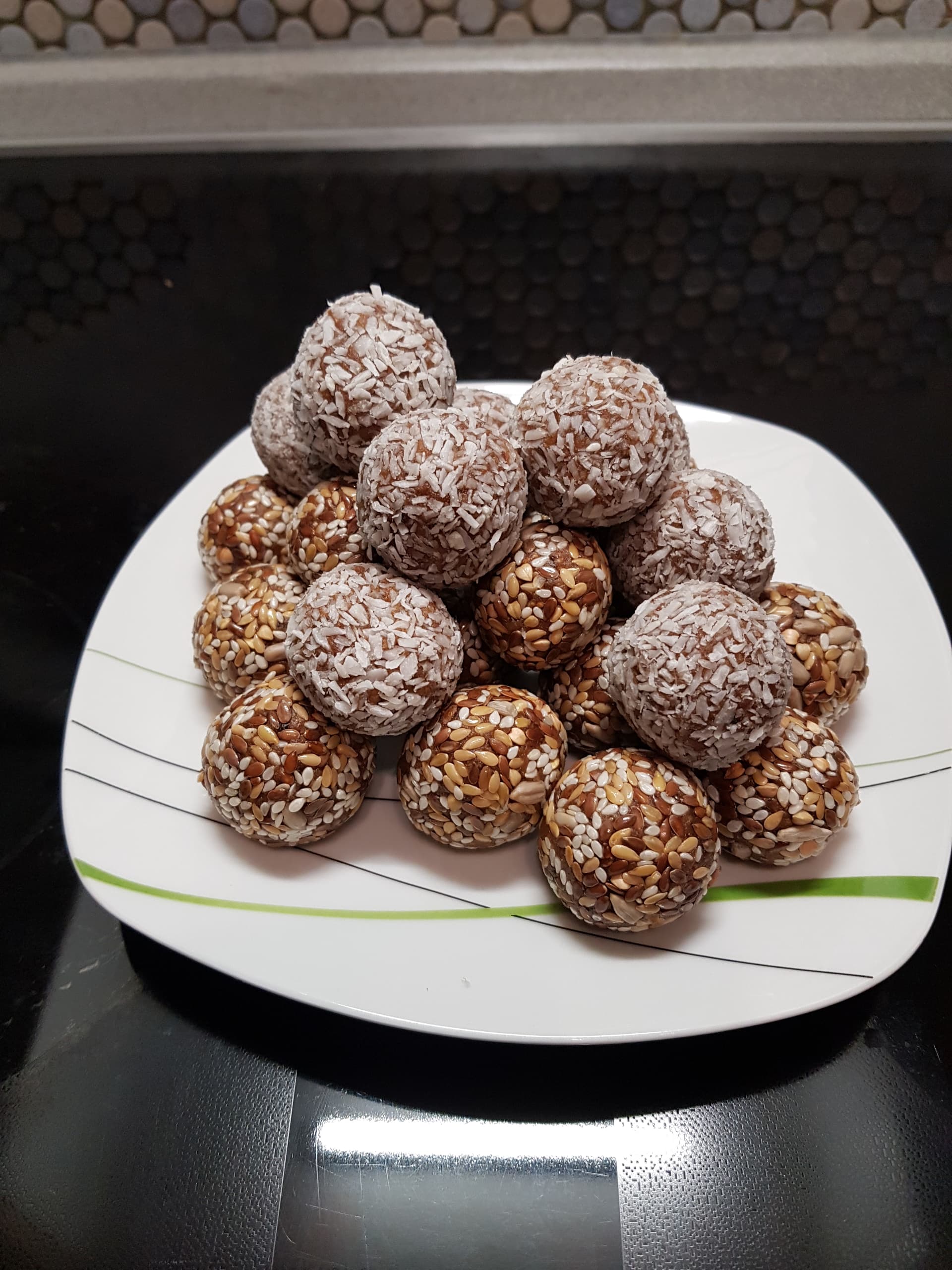 Bliss Balls. Auch Energie kugeln genannt. Besteht aus beliebigen Nüssen, Feigen, Nussmus, Haferflocken und Chiasamen. Und beliebigen Gewürzen