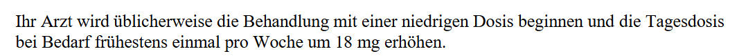Oder will sie den Test mit 18 mg, um zu sehen, ob Du damit unterhalb des therapeutischen Bereichs liegst? Ist genauso Blödsinn. Weil es eben auch sein kann, dass die 18 mg nicht ausreichen, selbst wenn Du im (unteren) therapeutischen Bereich liegen würdest.
