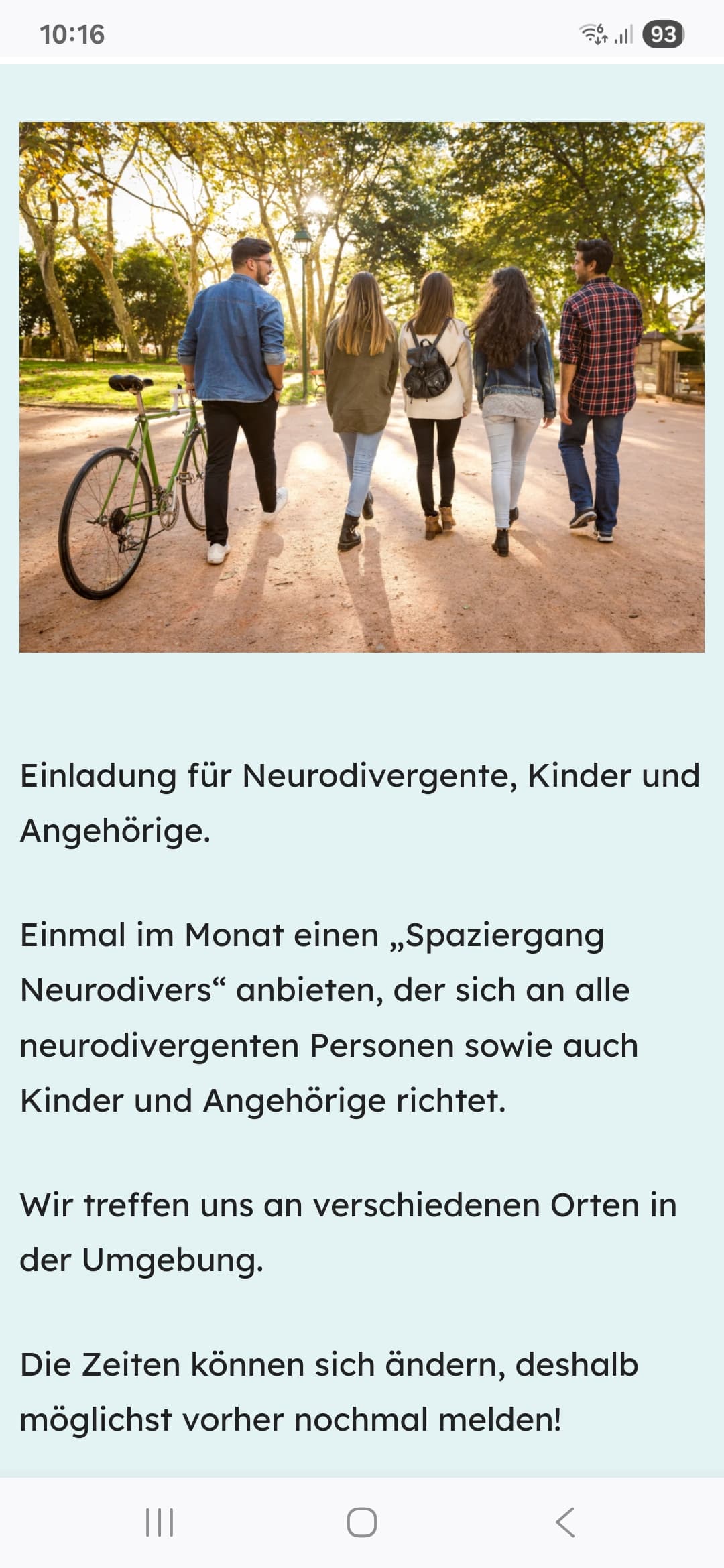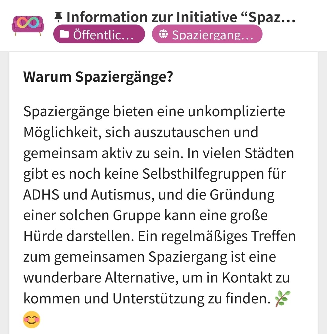 In anderen deutschen Städten laufen die “Spaziergänge Neurodivers” schon eine Weile. Jetzt hab ich in München einen regelmäßigen Spaziergang in die Wege geleitet. Wer auch interessiert wäre, mal mitzuspazieren, einfach googeln nach “Spaziergang Neurodivers München” (oder eben andere Stadt). Der nächste in München findet am Sonntag 23. November statt. Alles unverbindlich, keine regelmäßige Teilnahme erforderlich. Der Spaziergang Neurodivers wird 1x/Monat angeboten, meist an einem Sonntag (zumindest unserer in München). Bei unseren ersten beiden Spaziergängen im September und Oktober waren wir zuviert. Für den 23. Nov. haben sich bereits 6 Leute angemeldet. Zur Info, weil hier ein ADHS Forum ist: bisher hatten alle Mitspazierenden in Münchenauch alle ADHS.
