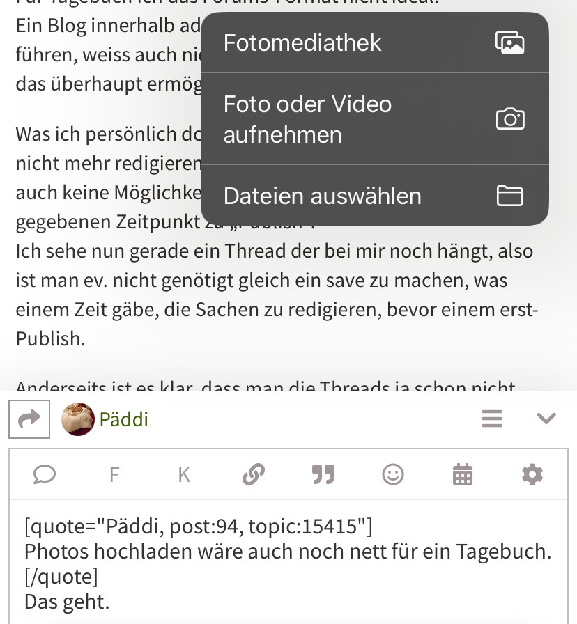Photos hochladen wäre auch noch nett für ein Tagebuch. Ich glaube zur Zeit kann man nur links plazieren, Wie ich sehe - vermutlich müssen diese https sein (ein http:// link auf ein Bild macht kein include).