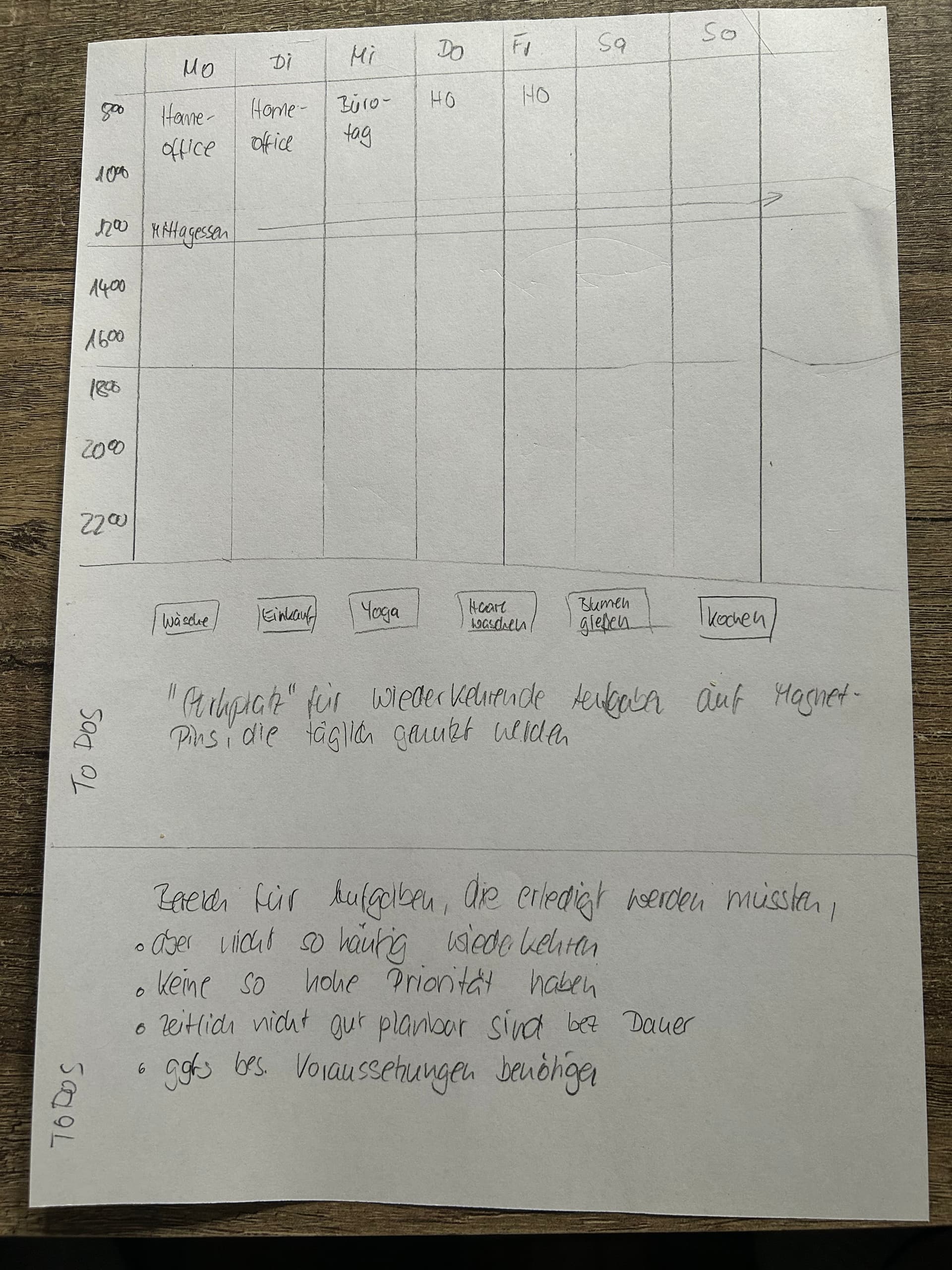 Ich möchte an jedem Wochentag die Konstanten definieren (aufmalen, permanentmarker). Also Wochenende, … und jeden Tag in die Tageszeiten einteilen. Dann möchte ich Wiedferkehrende aufgaben abbilden (Mittags: Fische füttern, …, Wochenende: Fernsehen erlaubt, …) Und dann möchte ich mit Magneten den Rest abbilden. Z.B. ein zusätzliche Fernsehsendung, die am Wochenende platziert werden kann, … Also so das klar ist, in jeder Woche gibt es eine gewisse Anzahl an „Ausnahmen“. Wenn diese ausgeschöpft sind, ist Diskussion unnötig …