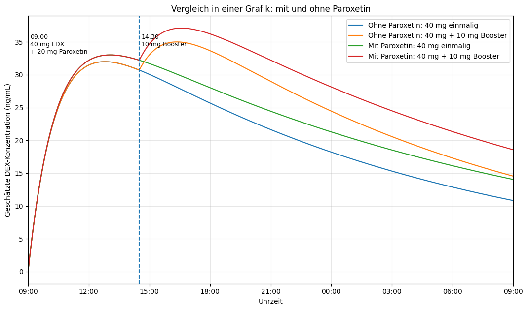 Ich entschied mich nun für Variante 1, da die Tagesabdeckung mein Hauptproblem ist, und wie ich die letzten Tage feststellen konnte, die Startdosis sehr wohl beeinflusst wird durch eine Booster einmahme am Vortag.